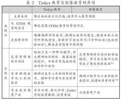 Tinker教育与创客教育既有区别又有联系,二者之间的异同如表2所示。