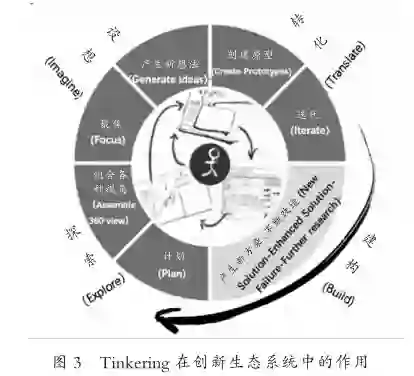 Tinkering作为一种知识生产模式,改变了传统学校教育过多关注理论成就,注重呈现科学研究的结果、忽视研究的过程,突出“理论优位”的教学内容观这一现状。“结论本位、理论优位”的教育方式,扼杀了学习者的批判意识、参与意识,背离了真正的科学探究与实践历程,无助于学习者形成正确的科学探究观念[22]。Tinkering则强调“理念更新、实践优位”,它在整个创新生态系统中的作用,如图3所示。