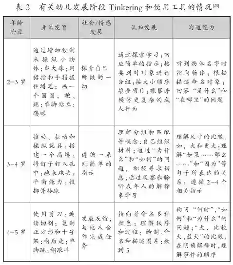 美国马萨诸塞州一直非常重视STEM教育的发展,其学前阶段幼儿Tinker教育的设计与实施也走在前列,如表3所示,Carole Charnow和Marcy Reed梳理了有关幼儿发展阶段Tinkering和使用工具的情况。