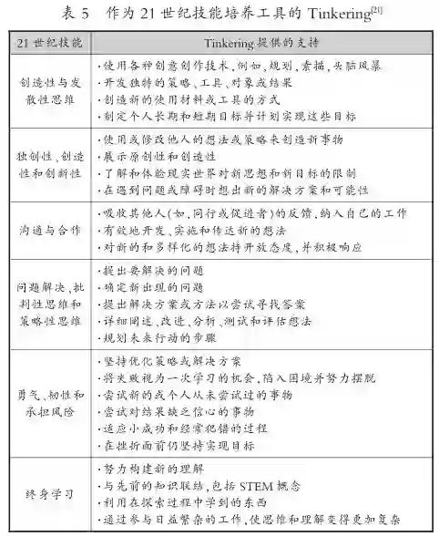 一个繁荣、健康、经济强大且可持续发展的社会,需要具有高度的积极性和社会参与能力,并能够找到新问题的创新解决方案的公民。Tinkering活动鼓励这些技能和思维模式的培养。从事Tinkering工作的学习者积极深入地参与任务或问题,他们自由研究,识别和解决问题,创造和创新。Tinkering有助于培养学习者的责任感、批判性分析、自我激励、问题解决、创业精神和终身学习能力,这些是培养21世纪技能的有力工具,具体见表5。