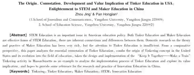 本文从比较的视角,剖析Tinker教育的内涵,梳理Tinker教育的发展演变,并以具体的实施案例探析其价值定位,以期能为我国创新教育(包括STEM教育及创客教育)的研究与实践,提供相关线索与依据。