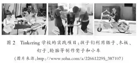 美国计算机科学家、教育家基弗尔•塔利(Gever Tulley)是Tinkering理念的忠实支持者和践行者。他在TED演讲《透过Tinkering教育生命》(Life Lessons through Tinking)中表达了自己的观点,感叹于数字世界及家长对于儿童的过度保护,剥夺了儿童“探索真实世界,与周围世界互动”的机会。2005年,基弗尔•塔利在美国旧金山创建了Tinkering学校(Tinkering School),致力于为6岁及更高年级的孩子提供课后项目、周末活动等,因此学校不设置课程,更没有考试,以鼓励孩子们基于真实的工具(包括木头、钉子、轮子、电动工具、绳子等),以团队的形式动手完成一个项目或作品(如图2所示),学习者的学习完全基于个人兴趣。