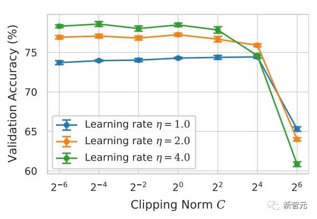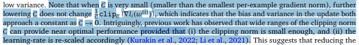 这篇文章前两个贡献其实非常 empirical,也很难深挖。而最后一个贡献很有意思 我仔细看了看超参数的 ablation study 发现一个原作者没有发现的点:在 clipping threshold 足够小的时候,其实 clipping threshold(也就是 clipping norm C,在上面的公式中和 R 是一个变量)没有作用。