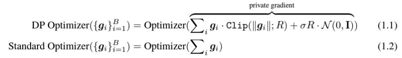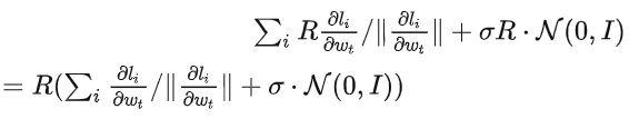 g_i 是 一个数据点的梯度(per-sample gradient),R 是 clipping threshold, sigma 是 noise multiplier。