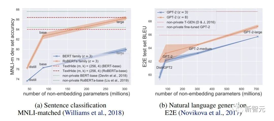 2. 在语言模型上,模型越大,性能会越好。比如 GPT2 从 4 亿参数到 8 亿参数性能提升很明显,也取得了很多 SOTA。(但是在 CV 和推荐系统中,很多时候更大的模型性能会很差,甚至接近 random guess。比如 CIFAR10 的 DP best accuracy 此前是由四层 CNN 得到的,而非 ResNet。)