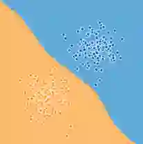 在一个二元分类或多类别分类问题中模型学习的类别之间的分离器。例如,下图就展示了一个二元分类问题,决策边界即橙点类和蓝点类的边界。