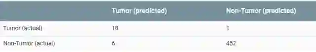 上述混淆矩阵展示了在 19 个确实为肿瘤的样本中,有 18 个被模型正确的归类(18 个真正),有 1 个被错误的归类为非肿瘤(1 个假负类)。类似的,在 458 个确实为非肿瘤的样本中,有 452 个被模型正确的归类(452 个真负类),有 6 个被错误的归类(6 个假正类)。