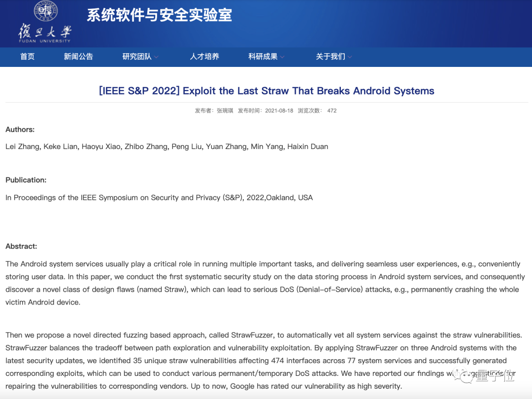 相关的研究成果已整理成论文《Exploit the Last Straw That Breaks Android Systems》,被网络安全顶会IEEE S&P 2022收录: