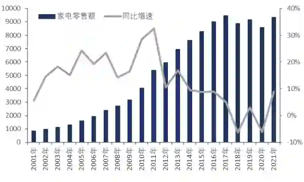 2001-2021年我国家用电器零售额及同比增速,单位:亿元 资料来源:wind,36氪整理