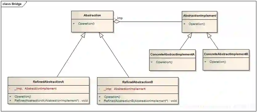 AbstractionImplement::Operation():实现抽象类Abstaction所定义操作的接口,由其具体派生类ConcreteImplemenA、ConcreteImplemenA或者其他派生类实现。
