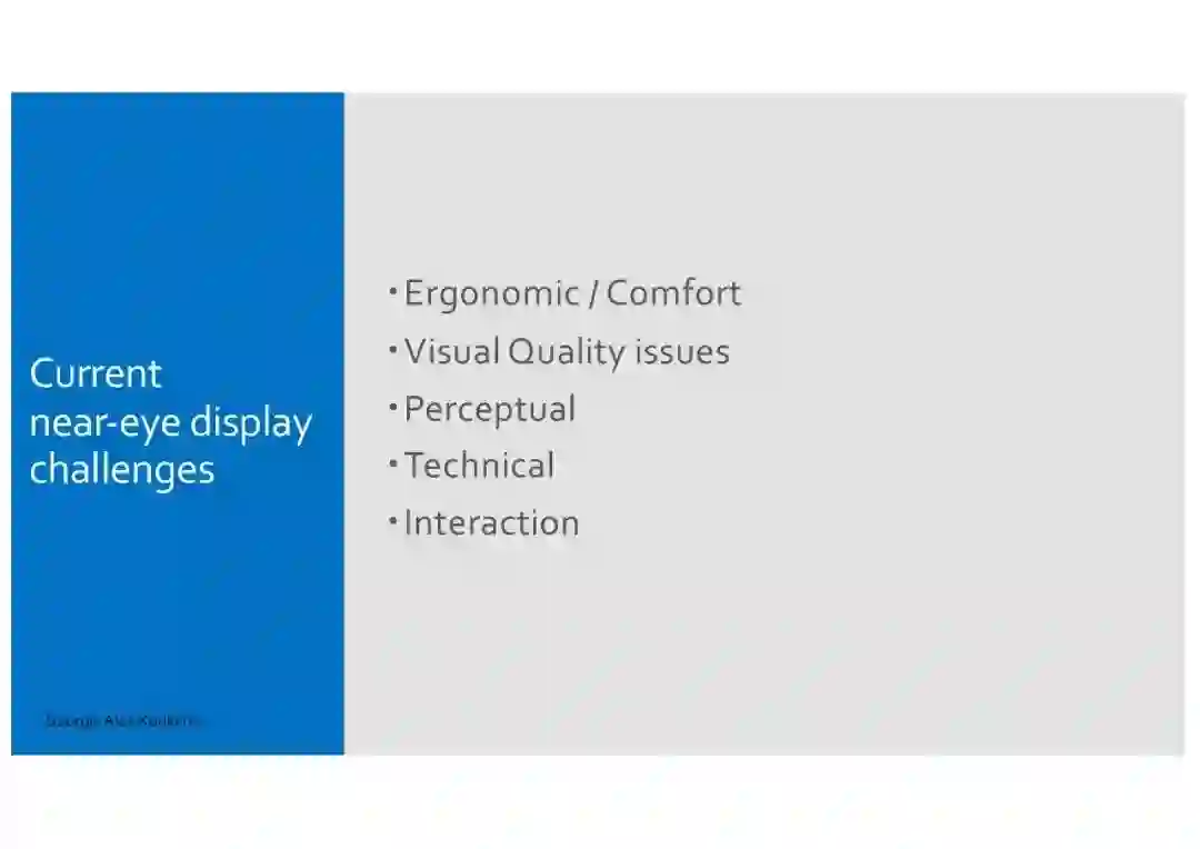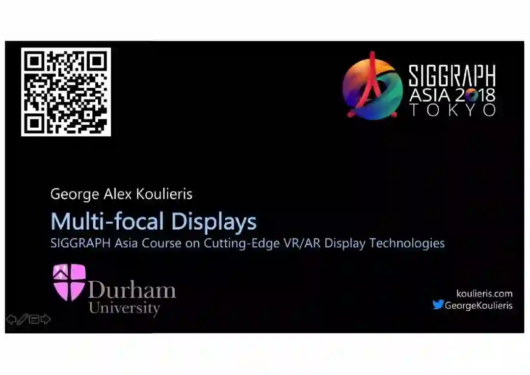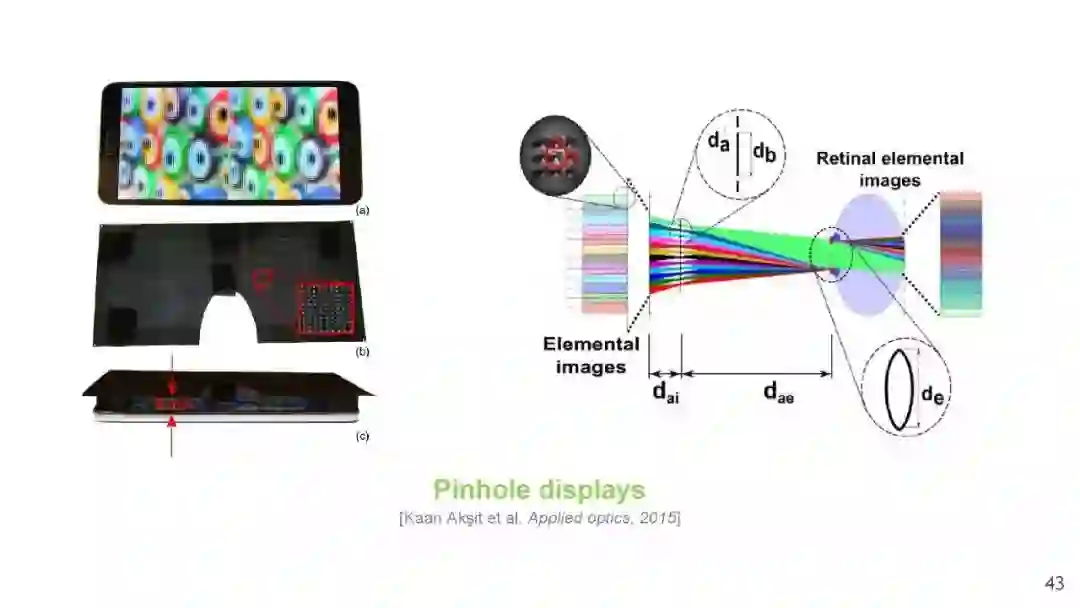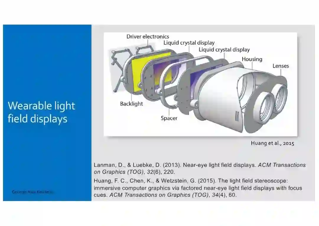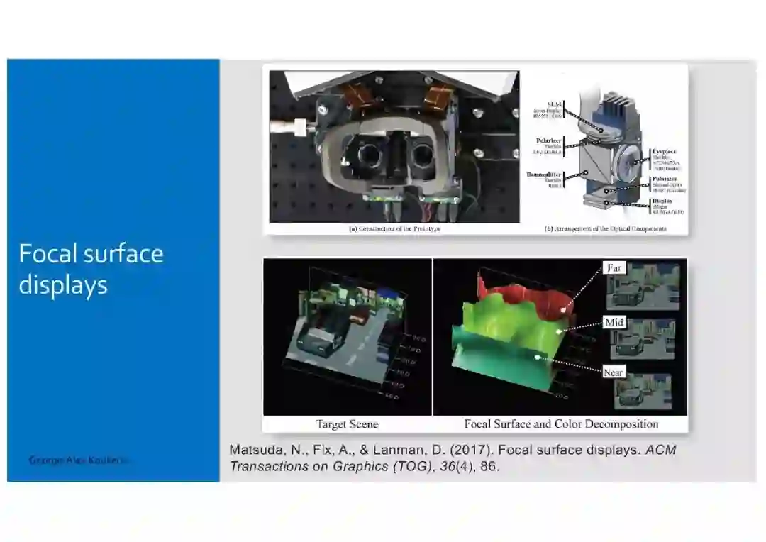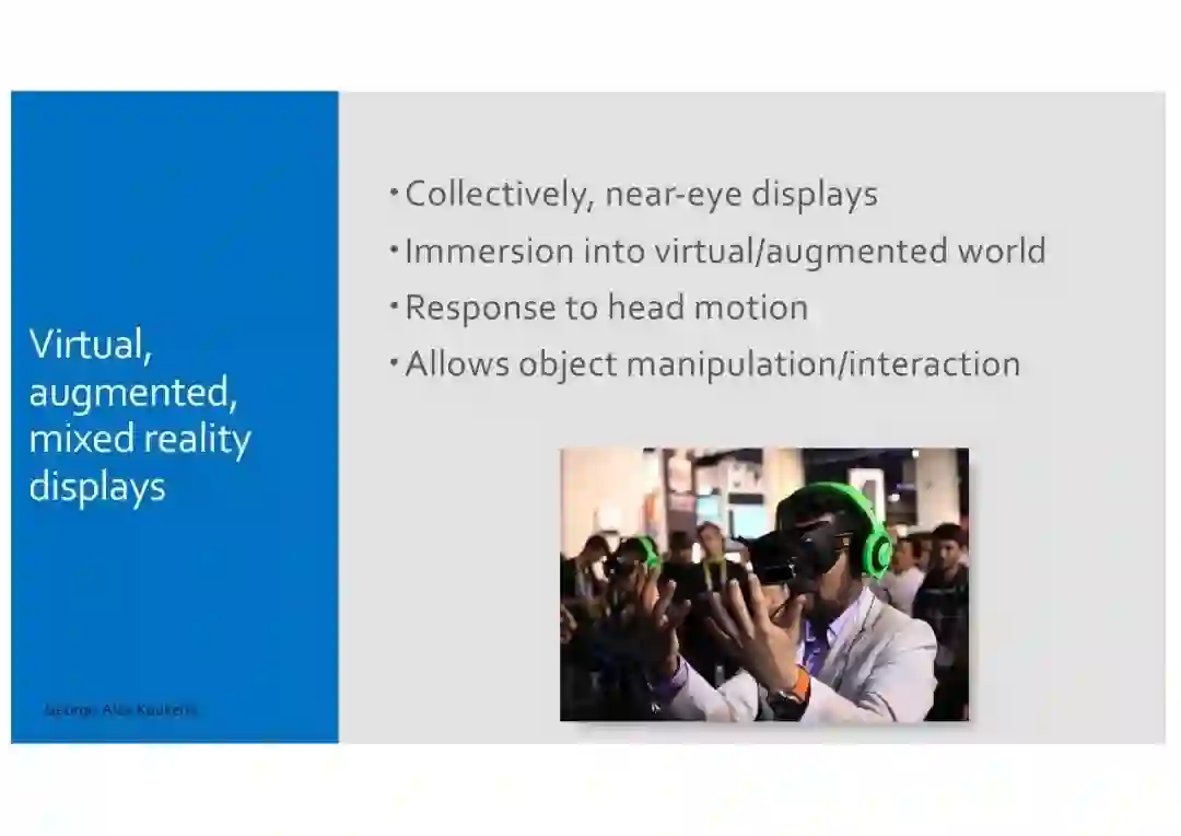 【导读】近眼(VR / AR)显示需要考虑技术,交互及视觉质量问题。 本教程将概述顶尖的VR / AR显示技术,重点关注技术,交互和感知问题,如果解决这些问题,将推动下一代显示技术的发展。本教程将展示近眼显示器的最新进展,并分析与下一代AR / VR显示技术相关的学术和工业研究的未来途径。