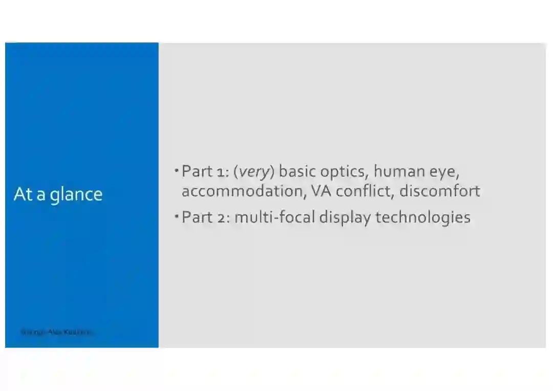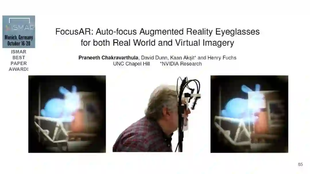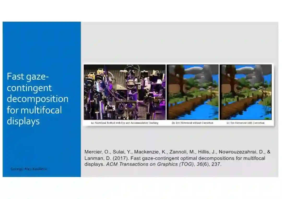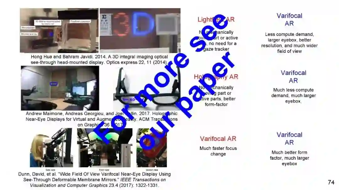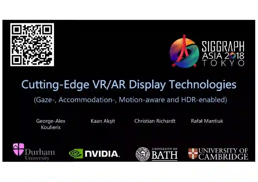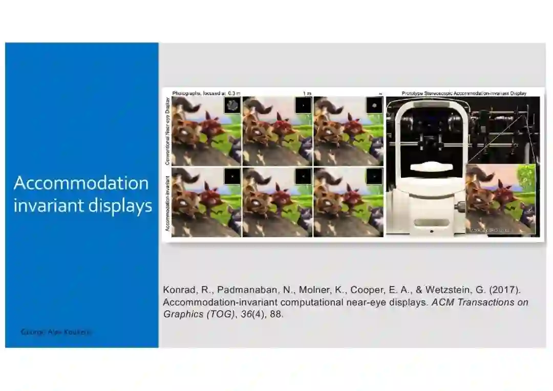 【导读】近眼(VR / AR)显示需要考虑技术,交互及视觉质量问题。 本教程将概述顶尖的VR / AR显示技术,重点关注技术,交互和感知问题,如果解决这些问题,将推动下一代显示技术的发展。本教程将展示近眼显示器的最新进展,并分析与下一代AR / VR显示技术相关的学术和工业研究的未来途径。
