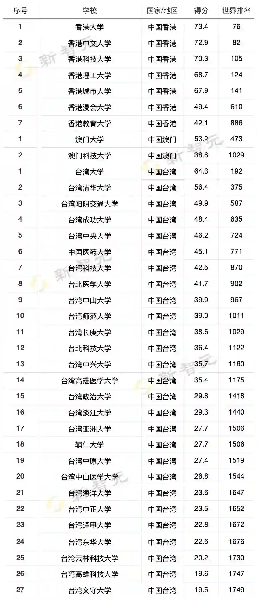 中国入围的高校中,大陆253所,香港7所,澳门2所,台湾27所。相较去年,中国高校整体排名进步较大。
