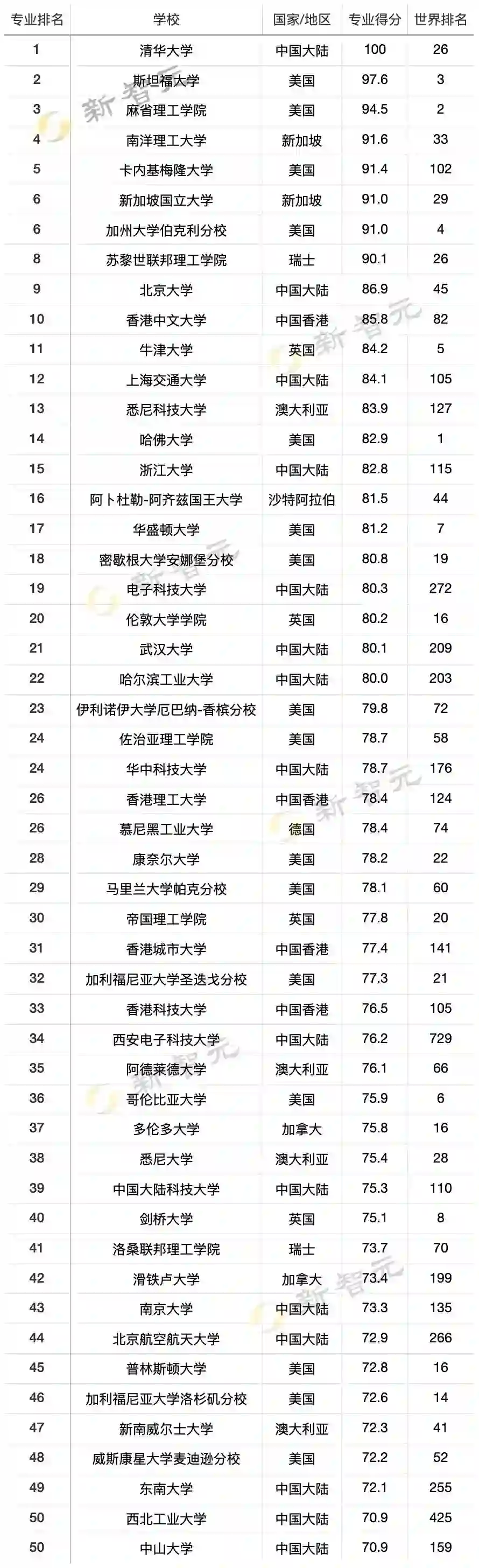 除了清华和北大,上海交通大学(12名)、浙江大学(15名)、电子科技大学(19名)、武汉大学(21名)、哈尔滨工业大学(22名)、华中科技大学(24名)、西安电子科技大学(34名)、中国科技大学(39名)、南京大学(43名)、北京航空航天大学(44名)、东南大学(49名)、西北工业大学(50名)、中山大学(50名)纷纷跻身前50。