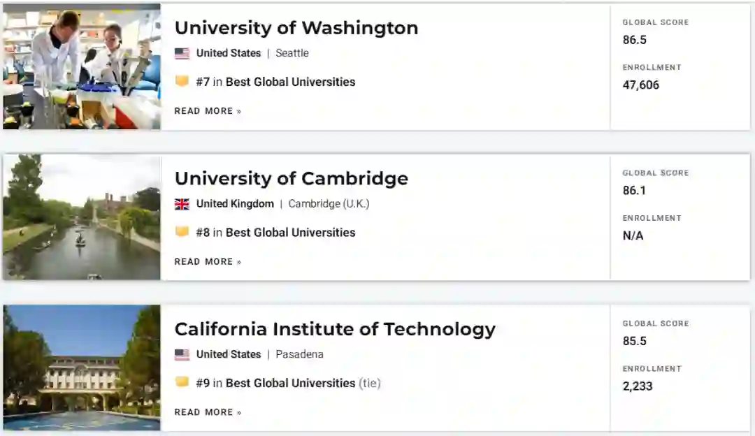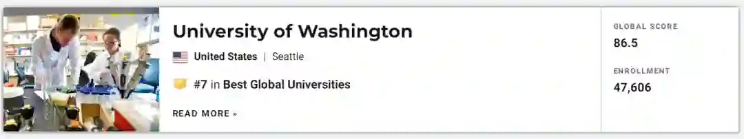 在今年9月13号发布的U.S.News美国大学综排中,华盛顿大学排名并列第59名,结果全球榜单一出,直接干过剑桥,力压加州理工,约翰霍普金斯等一众世界牛校,跻身全球第7!