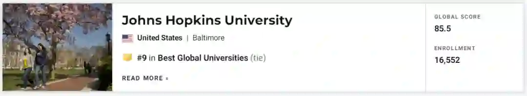 是的,约翰霍普金斯大学去年就靠着疫情播报被网友戏称「比川普靠谱」,成功出圈,一举冲进了U. S. News全球大学榜单前10,今年的它又再次保持住了名次。