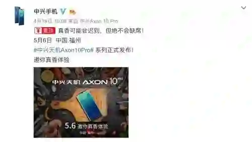 4月19日,中兴手机官方微博披露,中兴天机Axon10 Pro系列将于5月6日在福州正式发布。