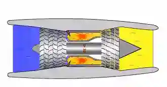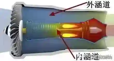 涡扇发动机分为内涵道和外涵道,内涵道原理与单纯的涡喷发动机无异,称为核心机。核心机驱动前方一个大风扇,推动气流向后,再加上外部整流罩行程外涵道。