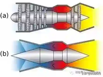 ▲(a)涡喷发动机(b)冲压发动机,可以看到冲压发动机省去了一系列的压气机和涡轮结构,变得更加轻巧,但只有高速下可以正常运转。