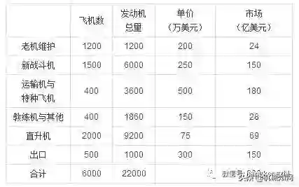 新战斗机发动机单价按高低型别均价计算。新机装备比按1.15、换发次数按1计算。部分数据作归整处理。军机发动机原则上应全部使用国产产品,或至少占比90%以上。