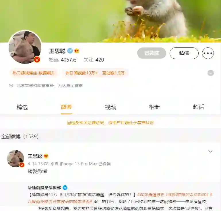 4月19日,王思聪微博主页显示,因违反相关法律法规,该用户目前处于禁言状态。其微博认证仍为北京普思资本董事长、万达集团董事。(蓝鲸财经)