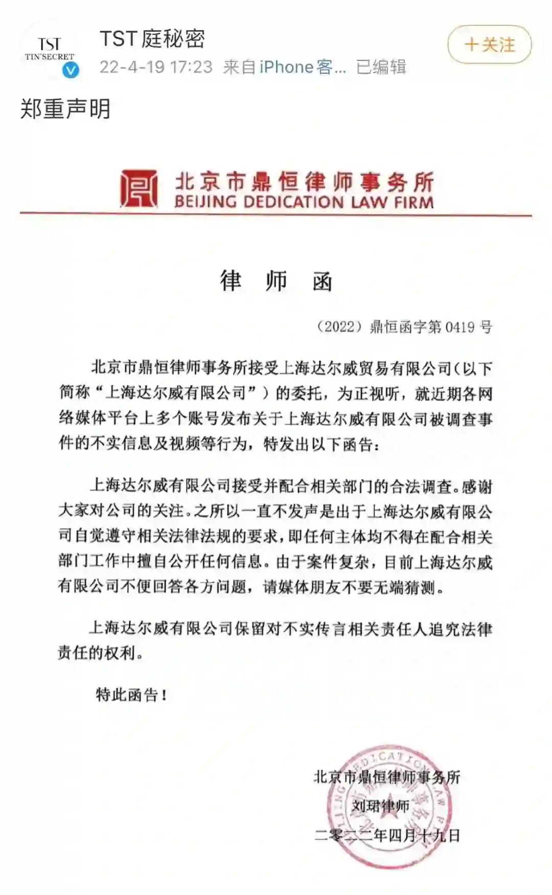 【张庭夫妇公司名下96套房产被查封,价值17亿元】张庭、林瑞阳夫妇创办、经营的达尔威公司因从事传销活动,导致公司名下96套房产被查封,价值17亿元,查封日期是2021年7月20日。这些房产系TST庭秘密在上海的办公大楼。4月19日,达尔威贸易有限公司官方微博发布律师函,称案件复杂,“请媒体朋友不要无端猜测”。(澎湃新闻)