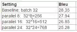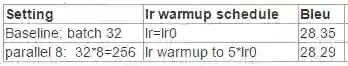 可以看到通过增加lr到5*lr0(理论上lr应该增加到8倍,但实际效果不好,因此只增加了5倍),并且通过warmup lr,达到和baseline差不多的Bleu效果。最终的收敛速度大约为5倍左右,也就是8卡能达到5倍的收敛加速(不考虑系统通信同步所消耗的时间,也就是不考虑系统加速比的情况下)。