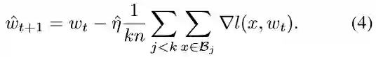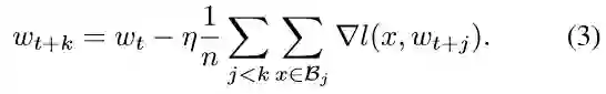 分别比较baseline和k个worker的large batch的更新公式[7],如下: