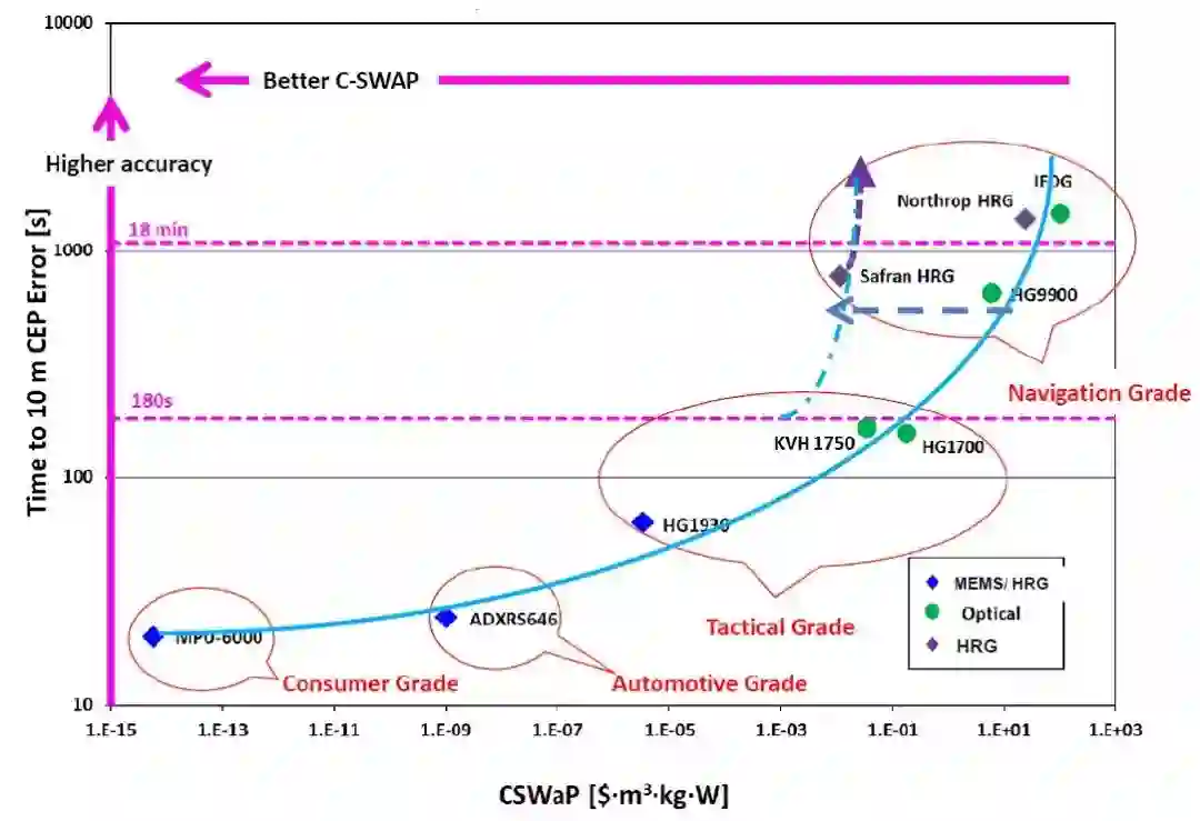 在DARPA公布的比较研究中,赛峰HRG被评为导航级领域中具有最佳成本、尺寸、重量和功率(C-SWaP)的传感器,可与霍尼韦尔公司的HG9900或诺格公司的HRG竞争。如图7所示,其它陀螺仪技术始终遵循性能与C-SWaP相关的趋势,而HRG正在改善这一趋势。