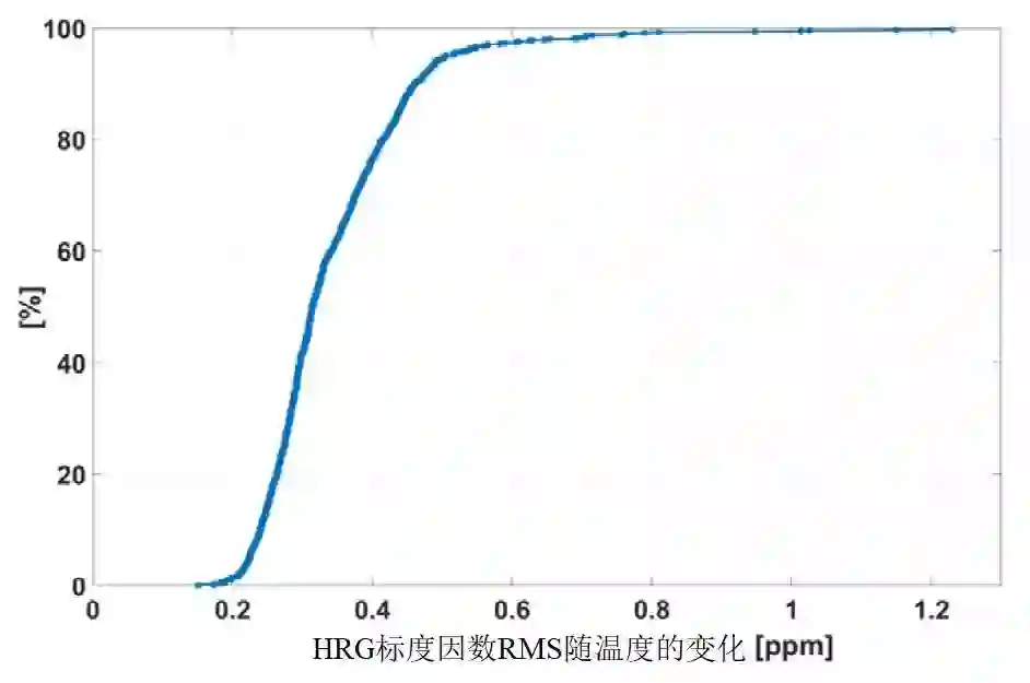 图13为热校准后的HRG标度因数残差总体密度(在-35 ℃~+80 ℃温度范围的RMS)。结果表明,在-35 ℃~+80 ℃温度范围内,100%的CrystalTM HRG标度因数在0.2~1.6 ppm(RMS)之间,完全符合表4中陀螺仪标度因数的要求。