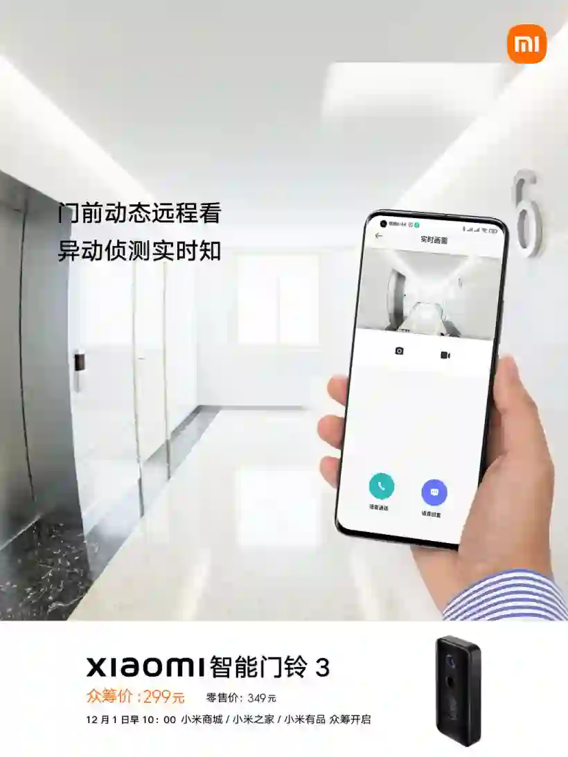 小米商城今日上架了新品小米智能门铃 3,据官方介绍,小米智能门铃 3 拥有 180 度大视野,2K 分辨率,支持门前异动通知,内置 5200mAh 大电池,拥有 4.8 月续航。小米智能门铃 3 在 2 代的基础上对分辨率、视角和镜头上进行了升级,搭载人体感应传感器和 Al 人形识别技术,全天候监测异动。小米智能门铃 3 支持双向通话,智能变声,可选小丑声和大叔声,不暴露年龄和性别。而且还支持小爱同学联动,可通过小爱智能触屏音箱查看门口画面,与来访者进行双向对讲。小米智能门铃 3 将于 12 月 1 日 10 点开启众筹,零售价 349 元,众筹价 299 元。