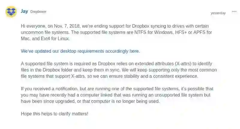 “大家好,在 2018 年 11 月 7 日,我们会结束 Dropbox 在某些不常见文件系统的同步支持。支持的文件系统是 Windows 的 NTFS、macOS 的 HFS+ 或 APFS,以及Linux 的 Ext4。
