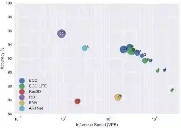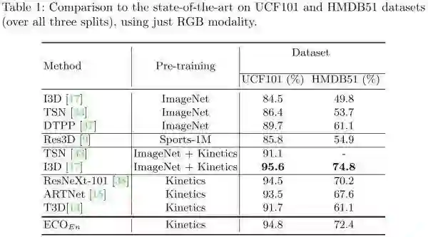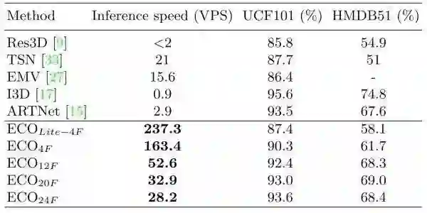 [1] Zolfaghari M, Singh K, Brox T. ECO: Efficient Convolutional Network for Online Video Understanding[J]. arXiv preprint arXiv:1804.09066, 2018.[2] Carreira J, Zisserman A. Quo vadis, action recognition? a new model and the kinetics dataset[C]//2017 IEEE Conference on Computer Vision and Pattern Recognition (CVPR). IEEE, 2017: 4724-4733.[3] Xu Z, Yang Y, Hauptmann A G. A discriminative CNN video representation for event detection[C]//Computer Vision and Pattern Recognition (CVPR), 2015 IEEE Conference on. IEEE, 2015: 1798-1807.[4] Qiu Z, Yao T, Mei T. Deep quantization: Encoding convolutional activations with deep generative model[C]//CVPR. 2017, 1(3): 4.[5] Wang L, Xiong Y, Wang Z, et al. Temporal Segment Networks for Action Recognition in Videos[J]. arXiv preprint arXiv:1705.02953, 2017.[6] Tran D, Ray J, Shou Z, et al. Convnet architecture search for spatiotemporal feature learning[J]. arXiv preprint arXiv:1708.05038, 2017.