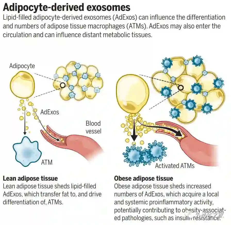 直径30-150 nm的外泌体和直径0.2-2.0 μm的微泡(MV)构成两种主要类型的EVs。外泌体和MV均可由多种细胞类型形成和释放,并含有多种成分,包括蛋白质、RNA转录物、microRNA、甚至DNA片段。当这些生物活性内容物转移到其他细胞时,会引起细胞活动和生物过程的变化。EVs的影响已经在疾病进展的背景下进行了最广泛的研究,特别是癌症,它们促进癌细胞生长、治疗抵抗、侵袭和转移。Flaherty等人的研究增加了EVs在调节生理过程中的重要性的新观点。实际上,AdExos不仅将脂肪从脂肪细胞传递到ATMs,而且还促进骨髓祖细胞分化为ATM样巨噬细胞,突出了这种形式的细胞间通讯如何通过影响常驻细胞类型来调节组织功能。