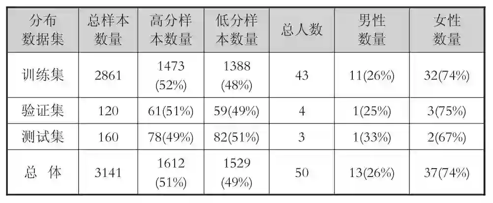 数据集的划分满足约束条件:第一,同一个学生仅出现于一个数据集中,避免用于训练和模型选择的样本出现在测试集中,即测试集相对于所训练的模型是完全未知的;第二,优先保障每个数据集中不同分数段的样本数量均匀;其次,尽量满足不同数据集上男女比例一致(约为1:3)。经过多次调整,最终的划分结果如表1所示。其中,所有数据集中的高低分样本比例都较为均匀;训练集和验证集的男女人数比例一致;由于不同学生的样本数量存在差异,测试集中的男性比例稍高于总体比例。