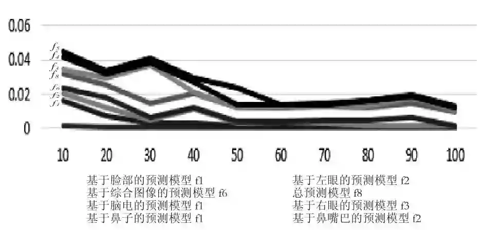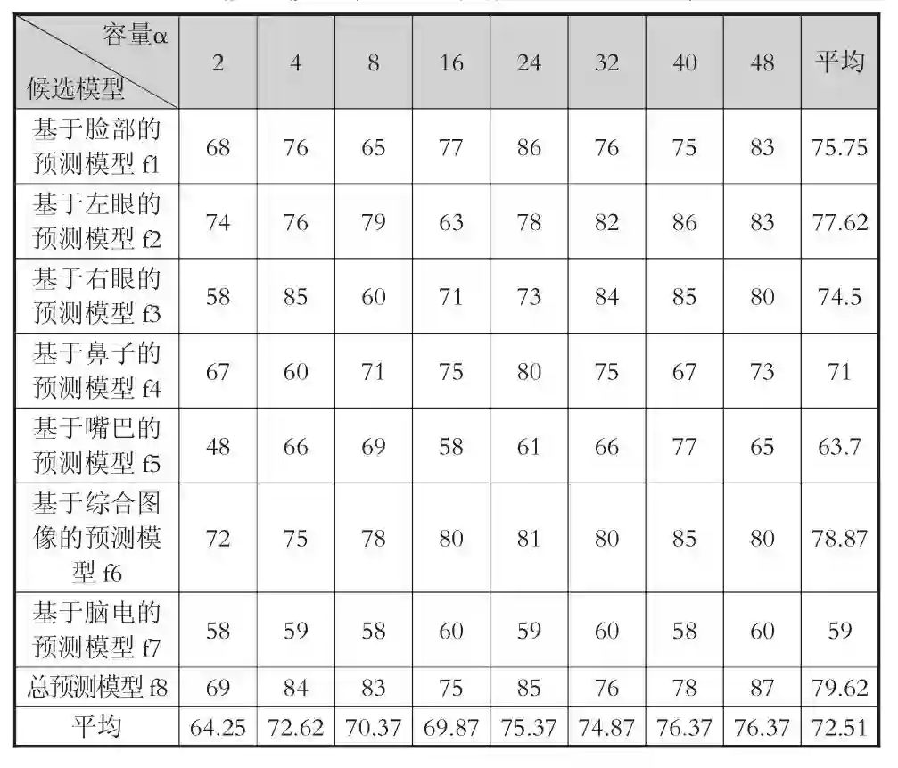 在实验结果中,α大于24的模型在验证集上的准确率约在75%。具体而言,对于相同容量条件,在预测模型中,总预测模型f8、基于综合图像的预测模型f6、基于左眼的预测模型f2在验证集上的准确率(本段中均简称“准确率”)都超过77%。在候选模型中,总预测模型取α=48时,准确率最高,为87%;其次是基于左眼、右眼、综合图像的预测模型(均高于85%)。基于脸部的预测模型准确率为75.8%,与平均水平(72.5%)相近。基于脑电、嘴巴、鼻子的预测模型准确率均低于平均水平。