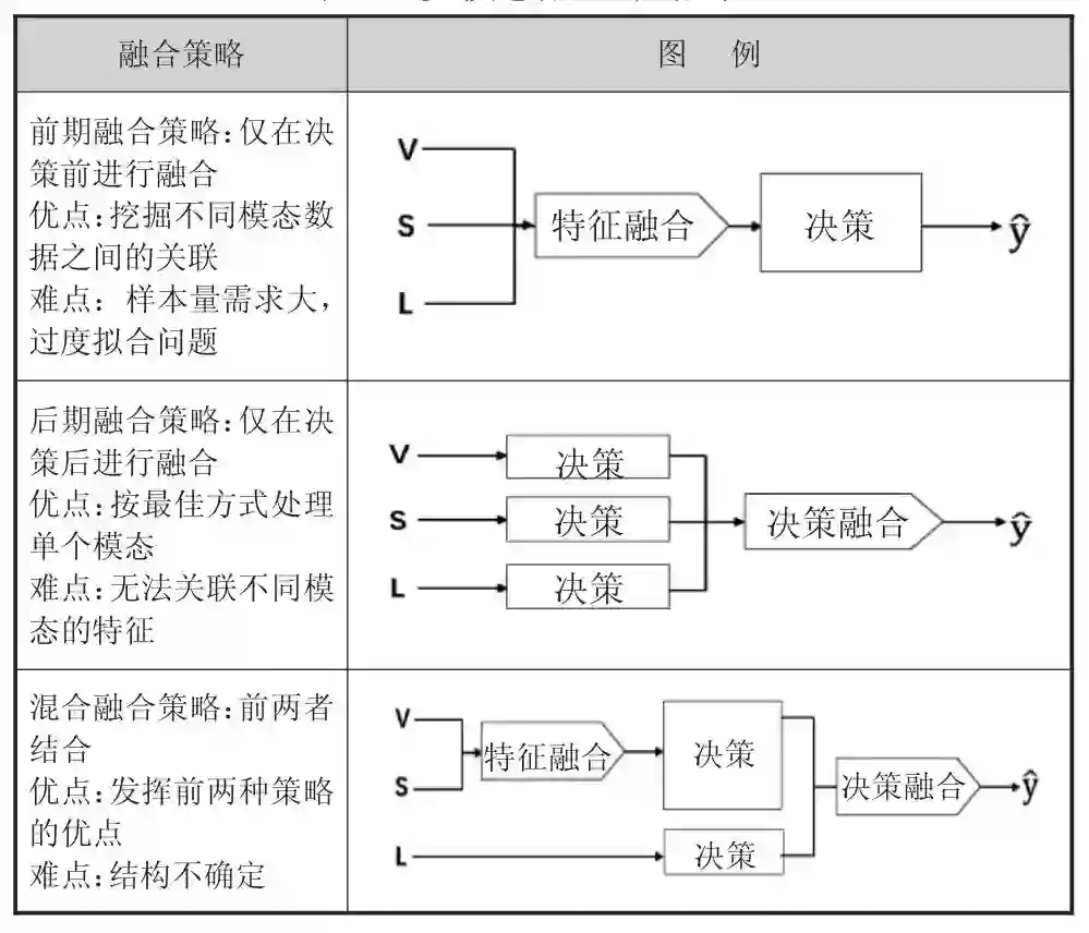多模态数据融合是发掘数据价值的重要条件。在本研究的多模态环境中,计算机可采集学习活动相关的多种信息(包含学习现场监控视频及语音,脑电波数据、在线日志学习记录等),如何根据计算机所采集的这些多模态信息,来综合判断学习参与度,需要选择一种合适的多模态融合策略。目前,深度学习领域典型的多模态融合策略主要有三种:前期融合、后期融合与混合融合[36]。三者的具体策略及优缺点,见表2。