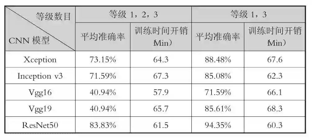(3)CNN分类模型的选择。卷积神经网络是一类多层神经网络,在图像分类识别方面有着较出色的研究成果,在其发展过程中,先后出现了许多优秀的网络模型。根据Canziani A.等人在2016年对各种网络模型的性能比较[37],以及查阅ImageNet大规模视觉识别挑战赛(ILSVRC)中出色网络模型的相关论文[38],目前主流的分类模型有 Vgg16、Vgg19、Inception v3、ResNet50和Xception等5种。为了确定选用何种模型,研究团队针对上述5种模型,进行准确率与训练时间的对比实验。实验的结果如表3所示。