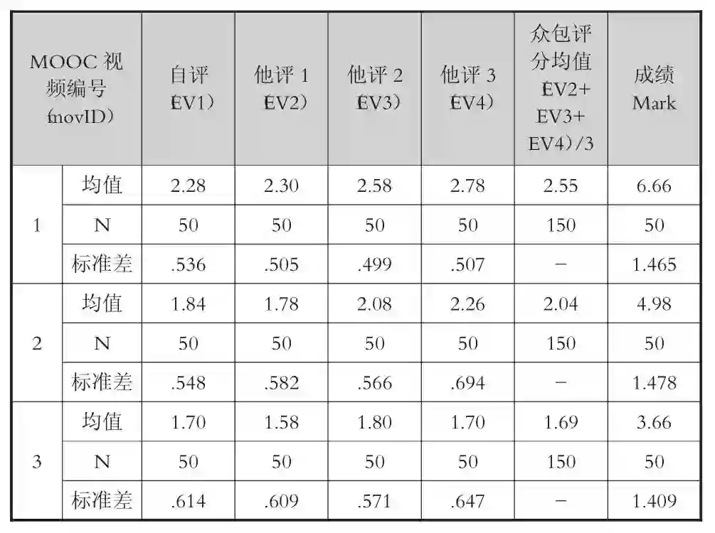 在实验过程中,每个被试均要对自己的参与情况打标签(EV1),并对另外三位被试的数据打标签(EV2、EV3、EV4),通过将记录的日志模态的数据导入SPSS,我们发现:自评和他评的数据存在一致性,采用众包(他评)的方法是可行的。同时,每个被试在实验的最后环节,需要针对视频中的学习内容做学习效果测试,得出一组测试分数(Mark),通过统计分析,得出表5。