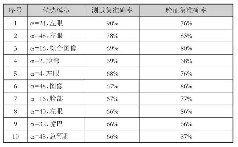 经过分析,主要的原因应是验证集和测试集的数据分布不一致。模型选择依赖于验证集,如果验证集与测试集的数据分布差异太大,则会直接影响模型在测试集上的准确率。我们搜索在测试集上准确率最高的模型,具体如表6所示。其中“α=48,总预测”一项为实验中选出的最佳模型,在测试集上的准确率仅排在第10位;而“α=24,左眼”则以非常高的准确率(90.6%)排在第1位。这说明,虽然本实验所选取的验证集和测试集分别在性别和参与度级别方面都较为平衡,但是仍然有性别、参与度级别以外的其它未知因素,影响其数据分布规律,其中可能的因素包括被试的表情习惯、行为习惯等。
