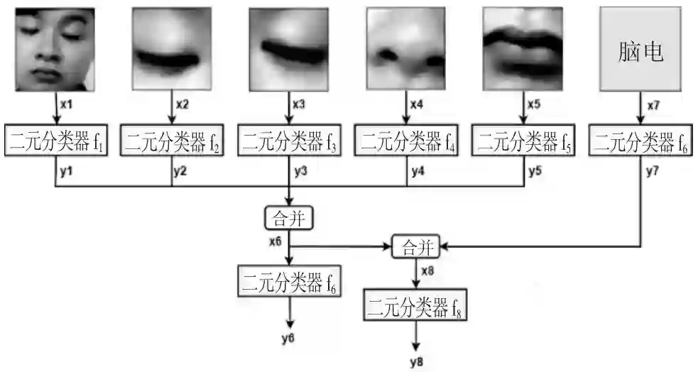 图7 中各符号的具体含义如下:①二元分类器:输入特定模态数据,输出一个0到1之间的值(代表学习参与度的预测值,0代表最低分,1代表最高分),结合阈值则可用于二类判别;根据输入的不同,二元分类器可以选择不同的神经网络结构实现,如采用CNN实现图片(实为矩阵)的分类,采用MLP实现向量的分类;②合并运算:将多个标量合并为一个向量,起多模态信息融合的作用;③基于脸部的预测模型f1:采用CNN结构,输入人脸整体图像x1,输出预测值 y1=f1(x1);④基于左眼的预测模型 f2:采用CNN 结构,输入左眼图像 x2,输出预测值 y2=f2(x2);⑤基于右眼的预测模型f3:采用CNN结构,输入右眼图像x3,输出预测值y3=f3(x3);⑥基于鼻子的预测模型f4:采用CNN结构,输入鼻子图像x4,输出预测值 y4=f4(x4);⑦基于嘴巴的预测模型 f5:采用 CNN 结构,输入嘴巴图像 x5,输出预测值 y5=f5(x5);⑧基于综合图像的预测模型f6:采用MLP(多层感知器)结构,输入向量 x6=(y1,y2,……,y5),输出预测值 y6=f6(x6);⑨基于脑电的预测模型f7:采用MLP结构,输入脑电信号 x7,输出预测值 y7=f7(x7);⑩总预测模型 f8:采用MLP 结构,输入向量 x8=(x6,x7),输出预测值 y8=f8(x8)。