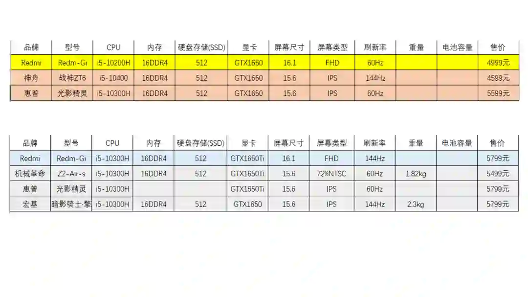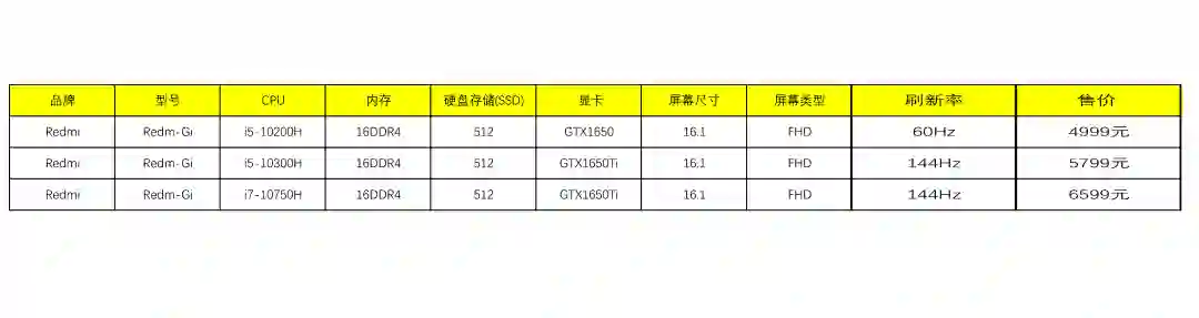 考虑完上面的问题,我们来具体分析一下,Redmi G 游戏本称得上为一款合格的游戏本系列的产品吗?走的是低价位入门版的游戏本。目前推出的三款配置如图所示,均是采用的 1650Ti 的显卡,我在某东上搜到与这款价位差不多,或同款配置的作为对照的参考目标。