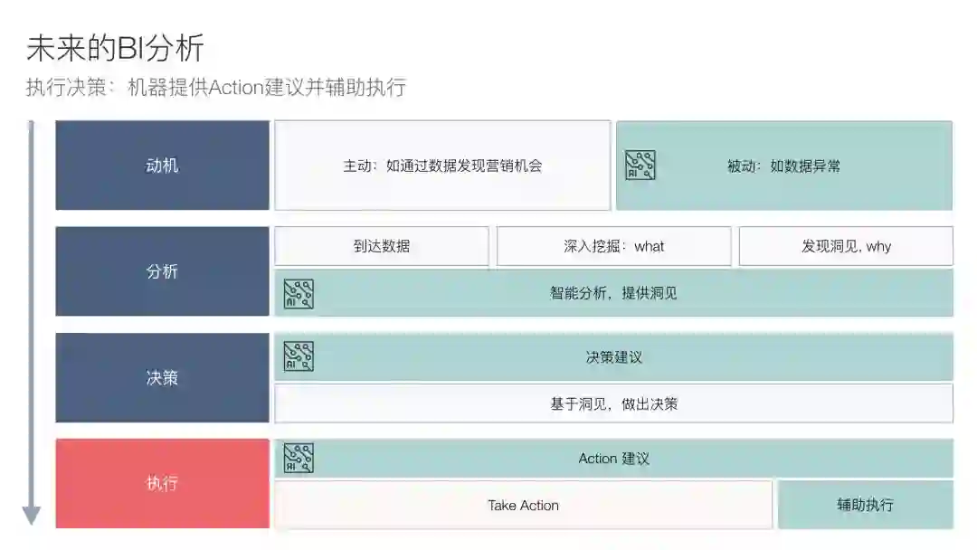 在这个Southport与MicroStrategy合作完成的案例中,我们可以发现未来的BI分析是一个非常直接、低门槛的过程,是一个用户与数据进行直接对话获得洞见,甚至辅助执行决策的体验。从前面提到的用户的商业分析决策场景的心智模型来看,我们会发现有了新兴技术后,每个环节的体验都不一样了。在动机产生环节,除去用户因为自己的核心数据指标需要主动探索的动机,AI也能够基于数据的动态变化与未来预测提示用户。尽管传统的BI产品都会提供一个基于数据阈值的提醒功能,在数据达到这个阈值时提醒用户,而AI的加入,能够在数据还未达到这个阈值,但预测可能会达到该阈值时进行前置提醒,这种提醒往往更有价值。在数据分析环节,AI能够基于统计建模等进行智能分析,将洞见直接提供给用户,而不再需要用户进行手动的数据钻取操作,大大的提高效率。在决策环节,AI能够基于学习进行一些决策的建议,人们可以在这些建议基础上做选择,或结合自己的感性经验做出更优良的决策,同时这也会反哺机器做决策建议的模型优化。到了执行环节,AI能够给一些执行的建议,也可以辅助执行一些简单的指令,例如前面video里,Alexa直接帮忙约了一个和工厂经理的会议。
