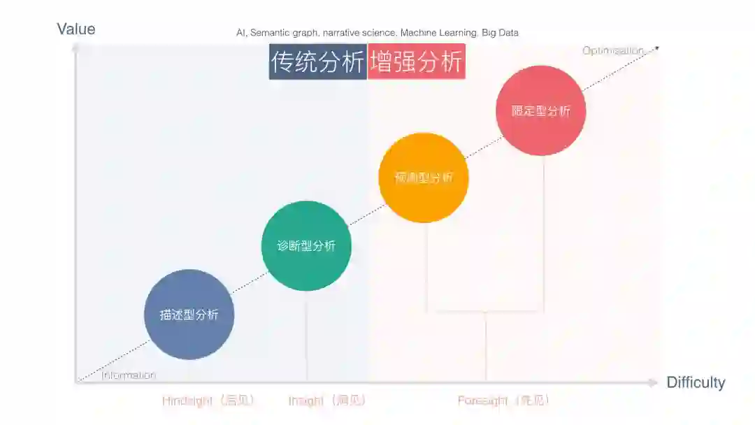 AI、semantic graph、narrative science、machine learning等新兴技术的日渐成熟后,传统分析的交互体验越加直观,而增强分析也成为了可能。Narrative science能够帮助提供描述型文字来解释可视化里蕴含的洞见。Semantic graph能够基于数据表现,将背后隐藏的一些原因与影响因素以可视化洞见的形式展现给用户。并通过预测建模、机器学习等AI技术实现预测型分析与限定型分析。