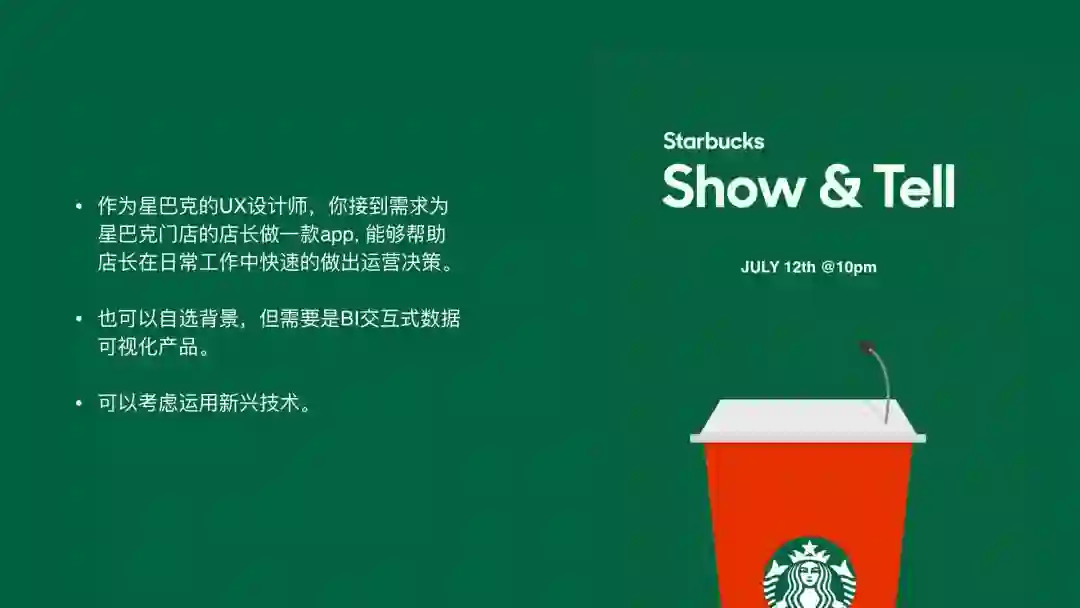在所有的内容分享结束后我们组织大家进行工作坊练习,基于故事型设计思维为星巴克店长设计一款BI应用,可以考虑运用新兴技术。