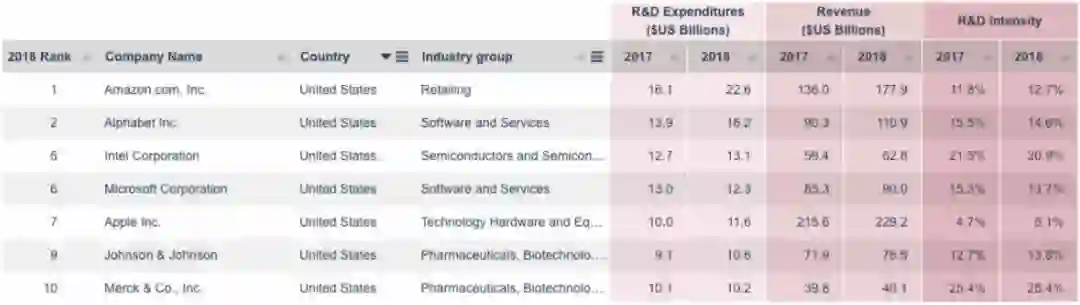 2018上半年,彭博社发布了 2017 全球企业研发投入排行榜,亚马逊以 226 亿美元的巨额投入高居榜首,这一数据比 2016 年翻了一番。