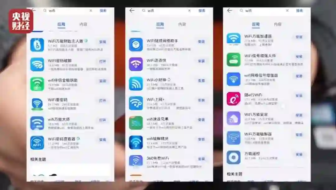 测试人员尝试了许多WiFi软件后发现,没有一个WiFi能够连得上,相反地,连接时点击的“确认”和“打开”字样的弹窗,都是伪装的广告弹窗,一旦用户被诱导点击后,便会发现手机上莫名其妙多了一些应用。