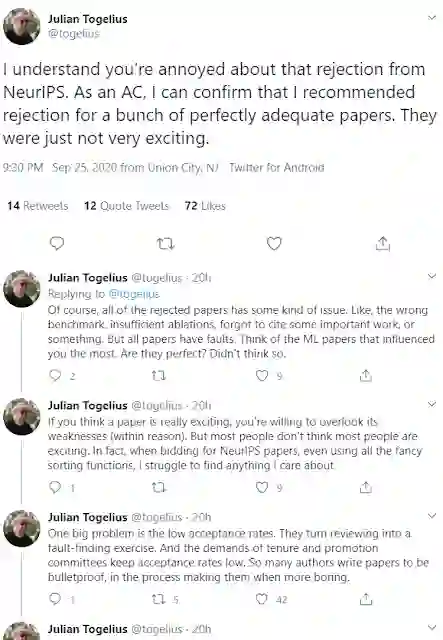 是否真实:这与「足够困难的问题」紧密相关。某些审稿人认为游戏是研究强化学习的优良试验场,但其它一些审稿人(通常来自典型的机器人研究社区)则认为 Mujoco Ant 和真正的四足机器人是完全不同的问题,在前一领域的算法比较并不能为后者的同类型实验提供任何见解。 你的研究是否符合良好的 AI 道德伦理?某些审稿人认为开发机器学习技术的目的是构建一个更好的社会,所以他们不会支持那些与他们的 AI 道德伦理观相悖的论文。今年,向 NeurIPS 提交论文时需要填写「Broader Impact(更广泛的影响)」称述,这说明该领域正在更为严肃地对待这一问题。举个例子,如果你提交一篇仅靠人脸识别来推断犯罪可能性的论文或一篇执行自动武器瞄准的论文,我相信不管你开发了怎样的方法,这篇论文都很可能被拒。 不同的审稿人在以上问题的优先级方面都有各自的看法,而且其中很多标准都非常主观(比如对问题的品味、道德伦理、简洁性)。对于以上的每一条标准,都有可能找出反例(但可能满足其它标准),而且其中一些反例还有很高的引用量或对机器学习领域有很大的影响。 Eric Jang的标准 我还想分享一下我在审议论文时的标准。在涉及到建议接收或拒绝时,我最关心的标准是正确性和新信息。即便我认为你的论文很无趣,在 10 年内都不可能成为一个活跃的研究领域,但只要你的论文能帮我了解我认为之前还没有过的新东西,我就会投支持票。 更具体地举几个例子: