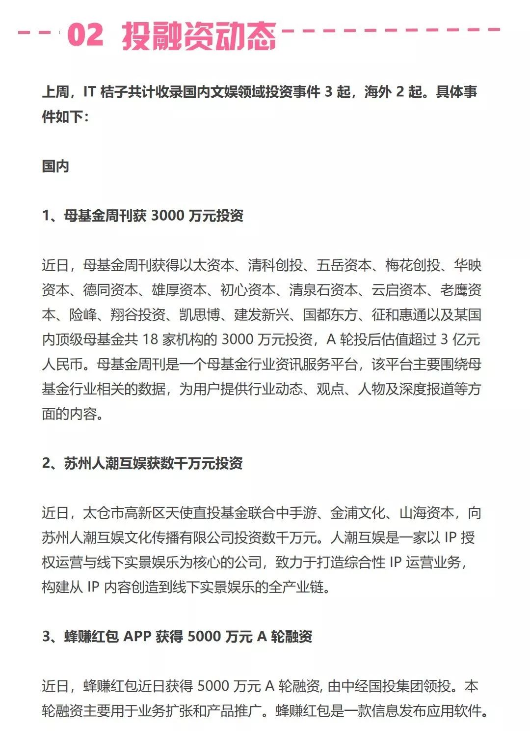 作为互联网创投数据服务商,IT 桔子也持续关注文娱行业,推出文娱周报栏目。栏目将汇总每周创投数据,通过数据解读,为大家还原上一周文娱行业的动态与风向。