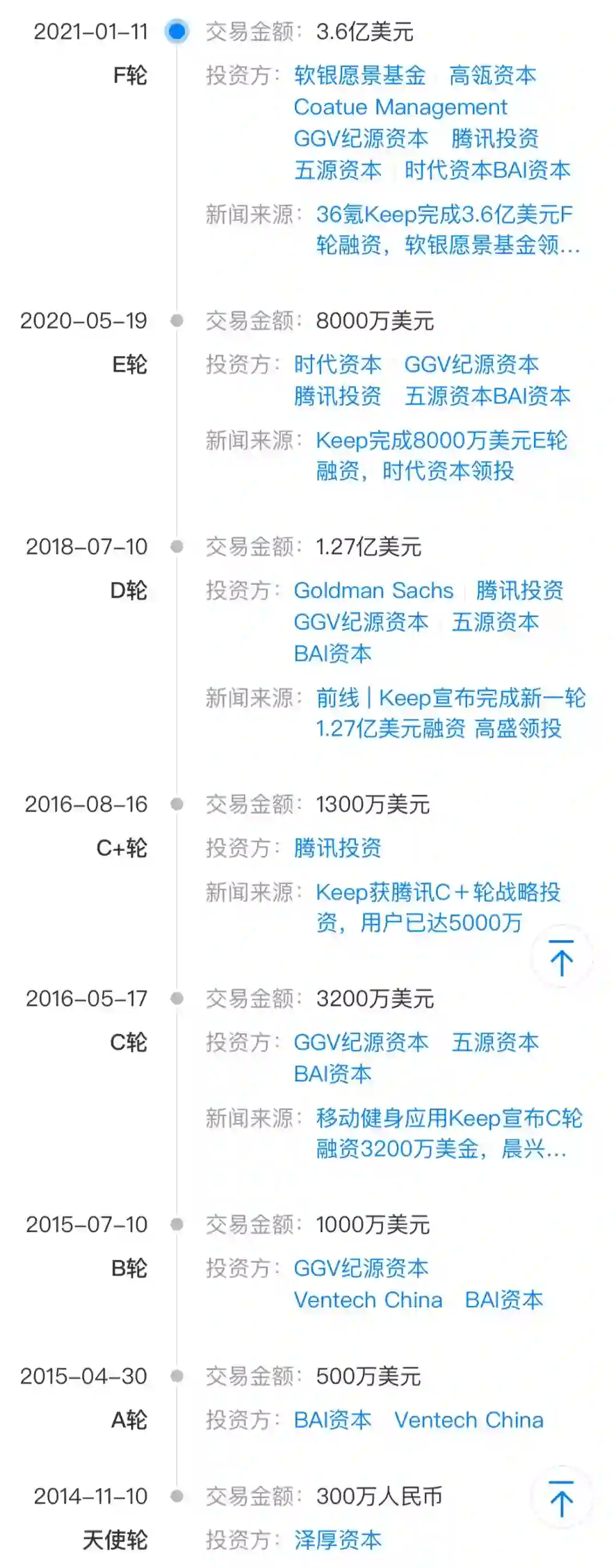 Keep最新一轮融资是于2021年1月宣布完成的3.6亿美元F轮融资,由软银愿景基金领投,高瓴资本、高都资本跟投,GGV纪源资本、腾讯、五源资本(原晨兴资本)、时代资本以及BAI资本等老股东继续追加投资。此轮融资后,Keep的估值翻了一倍,达到20亿美元。